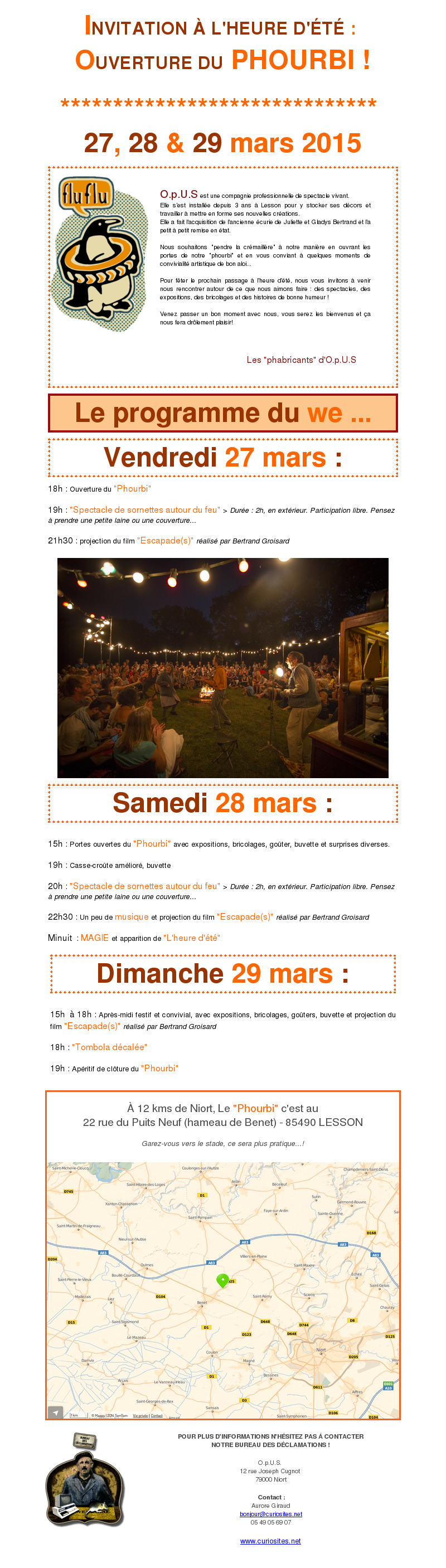 Vous êtes cordialement invités à assister à un joli tour de passe-passe à Lesson le 29 mars à l’occasion de l’ouverture du PHOURBI d’OPUS : Grâce à Kronos le magikos, à 1 heure du matin il sera minuit et le 29 redeviendra le 28 pendant une heure !!!!!